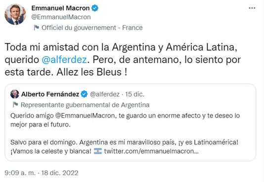 Una hora después, llegaría la respuesta del titular del poder ejecutivo argentino: “Querido amigo @EmmanuelMacron, te guardo un enorme afecto y te deseo lo mejor para el futuro. Salvo para el domingo. Argentina es mi maravilloso país, ¡y es Latinoamérica! ¡Vamos la celeste y blanca!”.