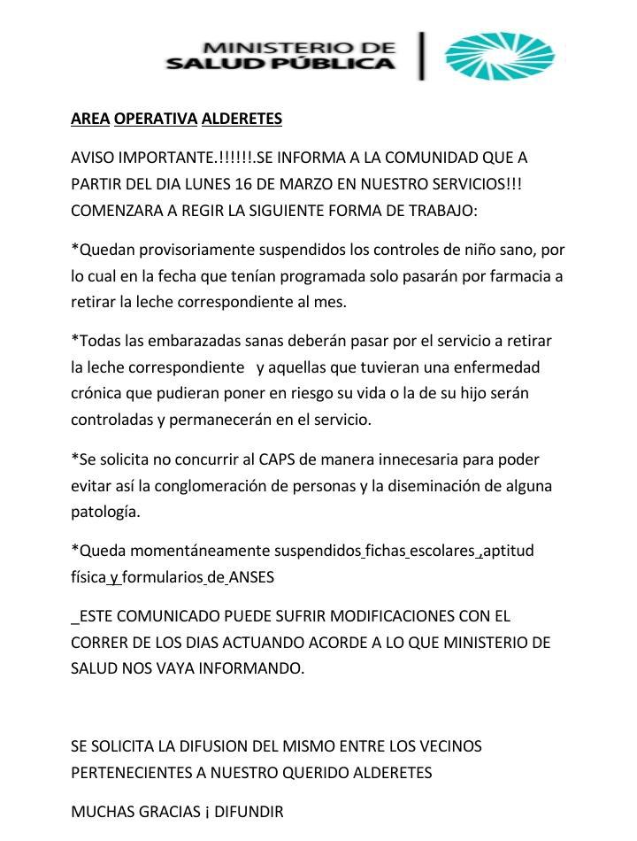 Nuevas disposiciones del Área Operativa Alderetes. Dicha oficina, Informa a la comunidad, que entró en vigencia una nueva forma de atenc