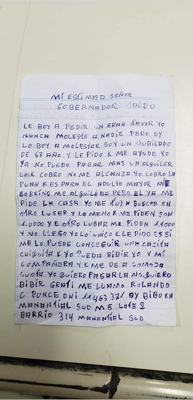 En su desarrollo, el texto cuenta que es un jubilado que alquilaba una casa a un familiar, que ahora la precisa. Por cuya situación debió salir a buscar alquilar en otros lugares, pero ante los elevados montos que le cobran, se dispuso apelar a la sensibilidad del gobernador, ya que no puede hacer frente al pago de un nuevo alquiler.