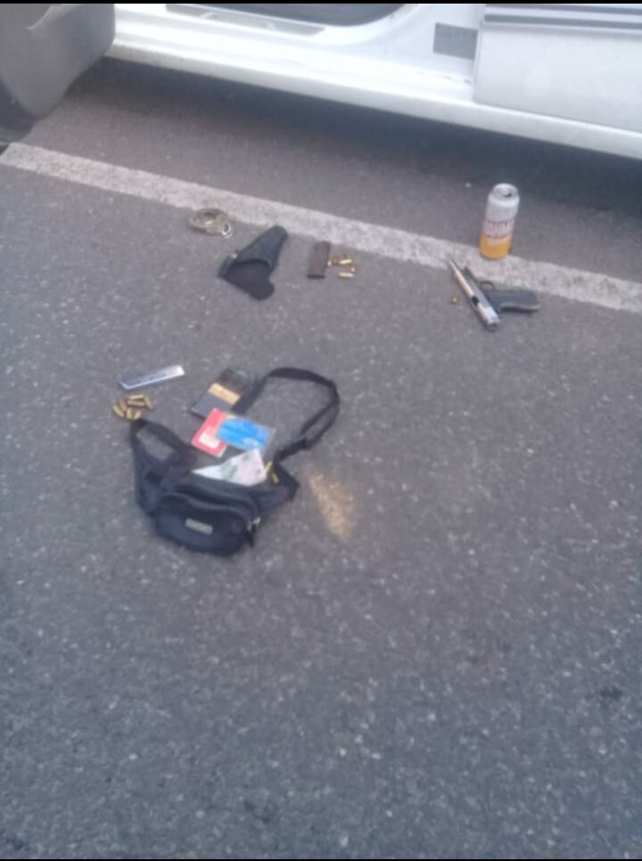 Ante tal situación los uniformados rodearon el automóvil e hicieron descender del mismo al sujeto para una minuciosa requisa y tras el procedimiento encontraron entre los objetos que llevaba consigo, una lata de cerveza, una navaja, un machete y el arma reglamentaria que exhibía para amedrentar a las fuerzas de seguridad.