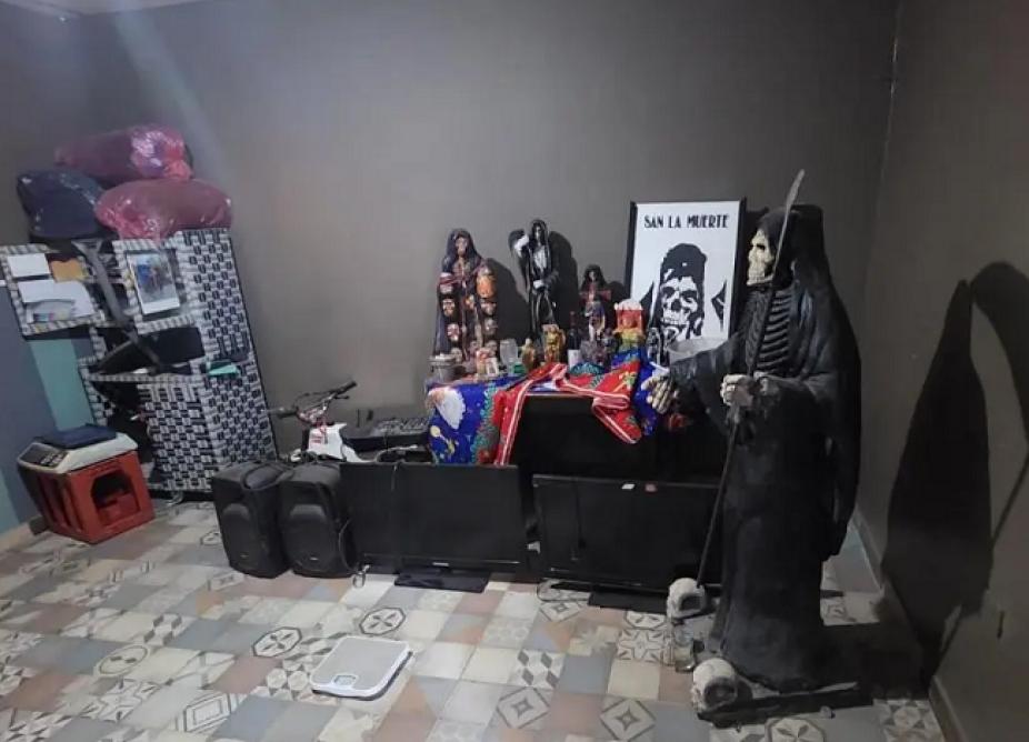 Los investigadores se sorprendieron al ingresar a unas de las viviendas, donde residía uno de los principales investigados, ya que en el interior de la misma encontraron un santuario dedicado a “San la Muerte” (montado sobre una mesa cubierta por un mantel navideño), encontrándose varios altares, estantes, cuadros, velas, también se aprecia una imponente imagen de yeso del mismo.