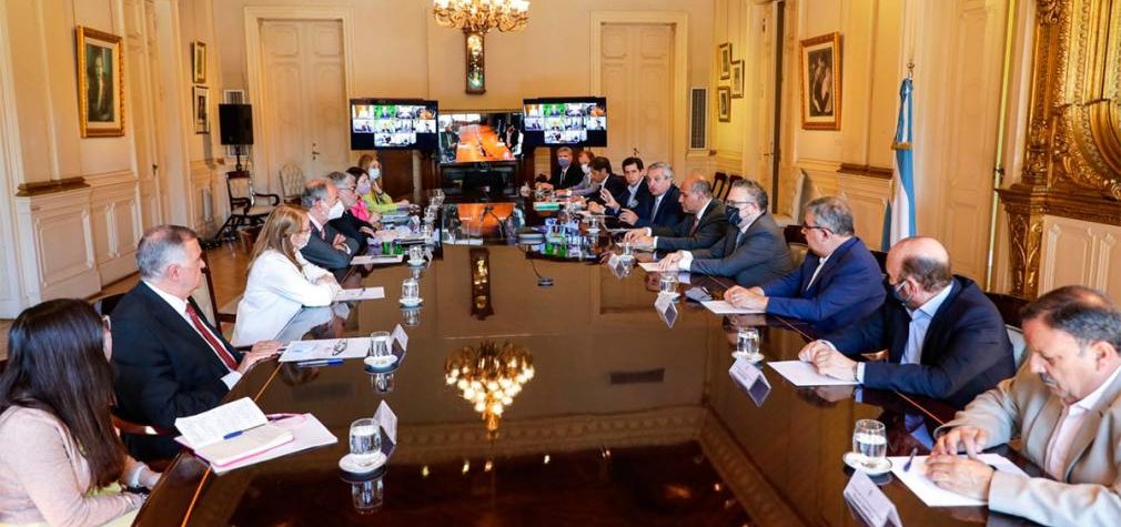 La reunión se realizó bajo modalidad presencial y virtual, el Salón Eva Perón de la Casa de Gobierno, con la presencia del jefe de Gabinete, Juan Manzur, y el ministro del Interior, Eduardo “Wado” de Pedro.