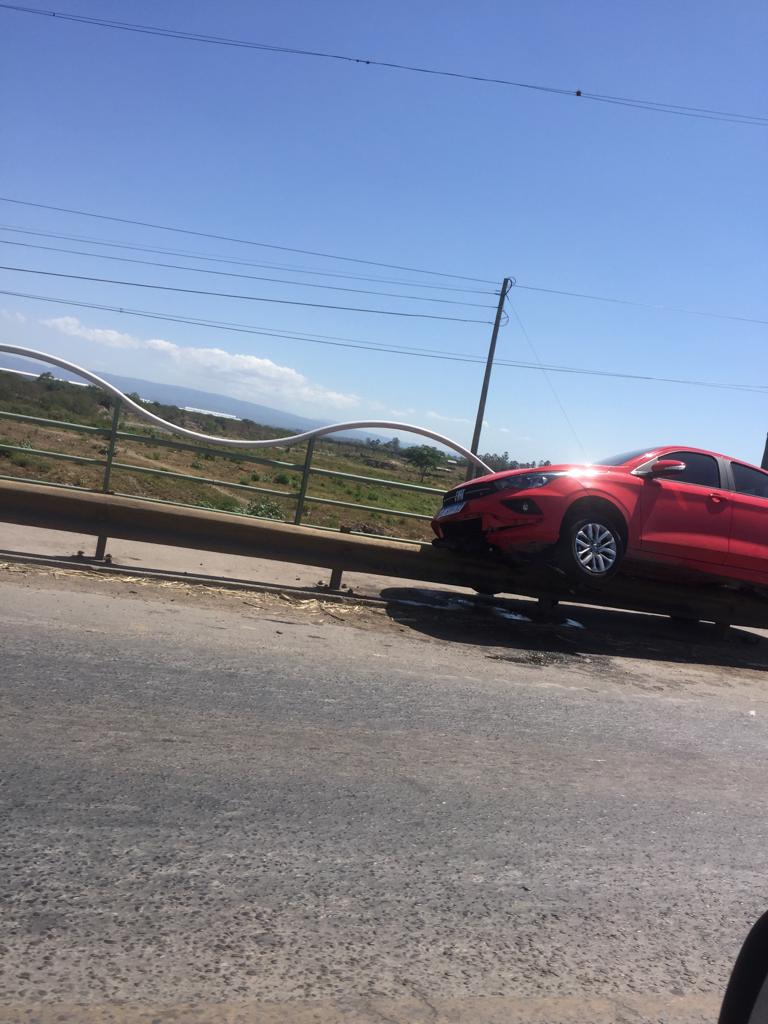 Y es que, al inicio de Autopista Presidente Perón un auto de porte grande y de color rojo había montado el guardaraíl derecho del puente, en dirección a San Miguel de Tucumán.