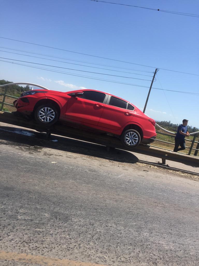 Los sorprendidos peatones y pasajeros veían asombrados que un auto rojo -de alta gama- había echo Willy al guarda carril y quedó suspendido a la mitad, en perfecto equilibrio sobre la barrera separadora de la vereda del puente, como si se tratara de una patineta acomodada cuidadosamente sobre el pasamanos de un acceso público cualquiera.