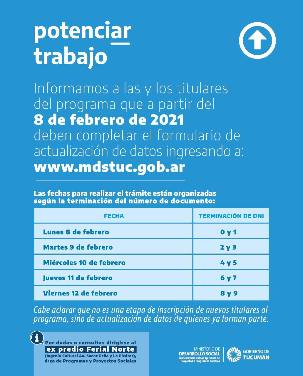 A partir del lunes 8 de febrero, hasta el viernes 12, empezará un proceso de actualización de datos de manera virtual. En base a la terminación del DNI, los titulares que ya se encuentran bajo programa, podrán acceder a un sitio web para su correcta actualización. Todo el proceso será virtual, para esto deberán entrar a la web del Ministerio de Desarrollo Social (www.mdstuc.gov.ar) en donde estará detallado el paso a paso.