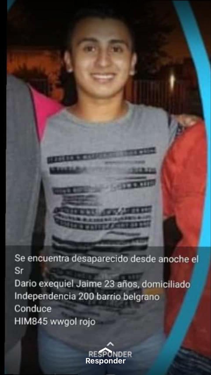 Darío, como todos los jovencitos, dijo “Ya vuelvo” cuando salió antes de ayer de su casa, mientras manejaba su auto rojo con la patente HIM 845. Su madre, Marta Álvarez lo vio vestido con una remera verde y pantalón largo.
